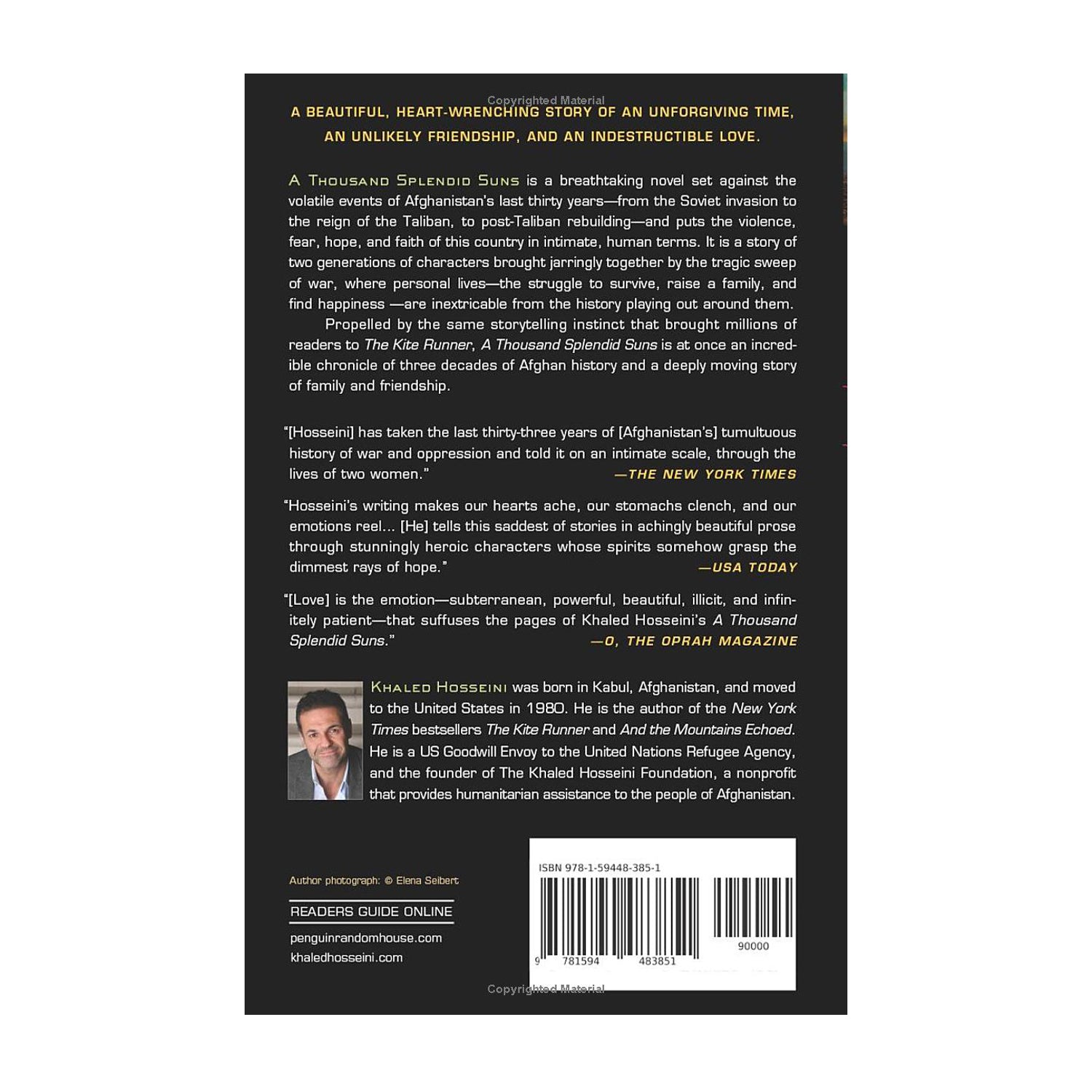 "A Thousand Splendid Suns" is a portrait of a wounded country and a story of family and friendship, of an unforgiving time, an unlikely bond, and an indestructible love.