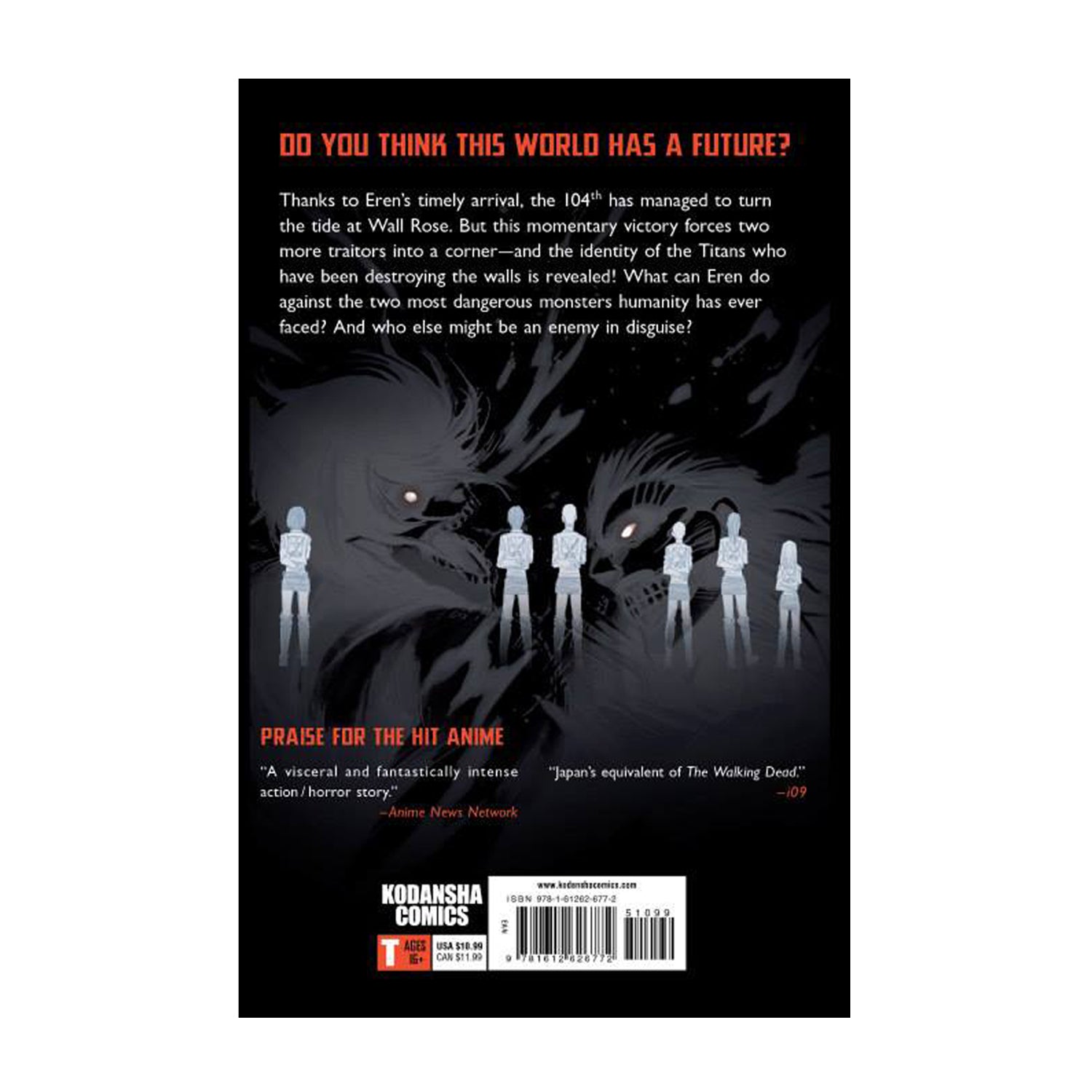 Thanks to Eren's timely arrival, the 104th has managed to turn the tide at Wall Rose. But this momentary victory forces two more traitors into a corner – and the identity of the Titans who have been destroying the walls is revealed! What can Eren do against the two most dangerous monsters humanity has ever faced? And who else might be an enemy in disguise?