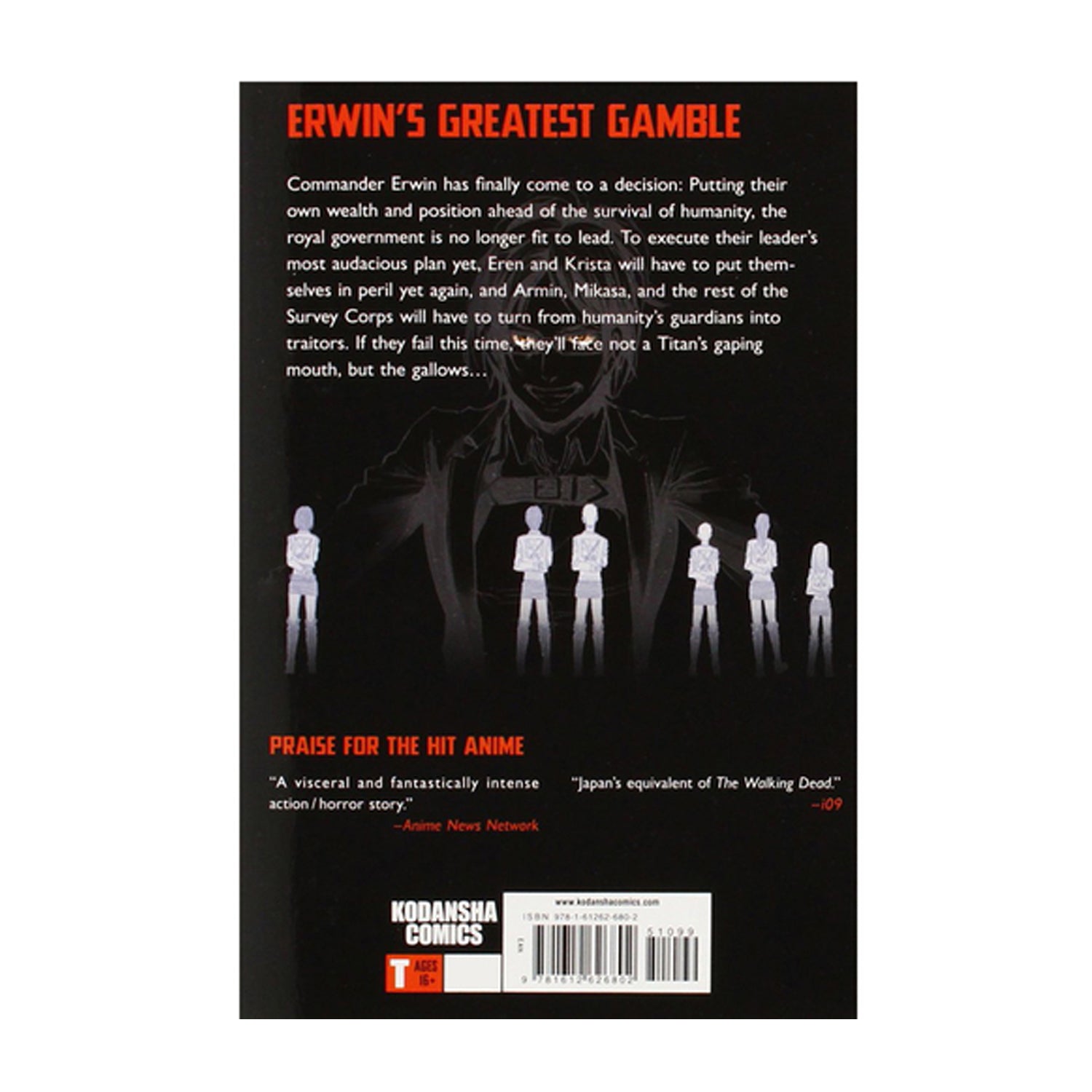 Commander Erwin has finally come to a decision: Putting their own wealth and position ahead of the survival of humanity, the royal government is no longer fit to lead. To execute their leader's most audacious plan yet, Eren and Krista will have to put themselves in peril yet again, and Armin, Mikasa, and the rest of the Survey Corps will have to turn from humanity's guardians into traitors. If they fail this time, they'll face not a Titan's gaping mouth, but the gallows...