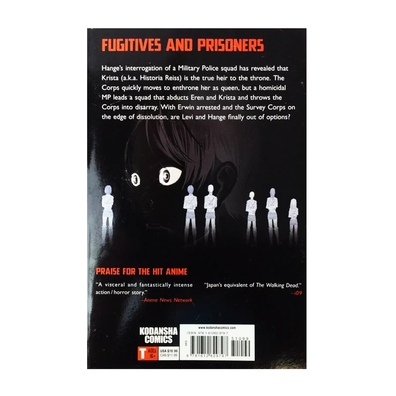 Hange’s interrogation of a Military Police squad has revealed that Krista (a.k.a. Historia Reiss) is the true heir to the throne. The Corps quickly moves to enthrone her as queen, but a homicidal MP leads a squad that abducts Eren and Krista and throws the Corps into disarray. With Erwin arrested and the Survey Corps on the edge of dissolution, are Levi and Hange finally out of options?