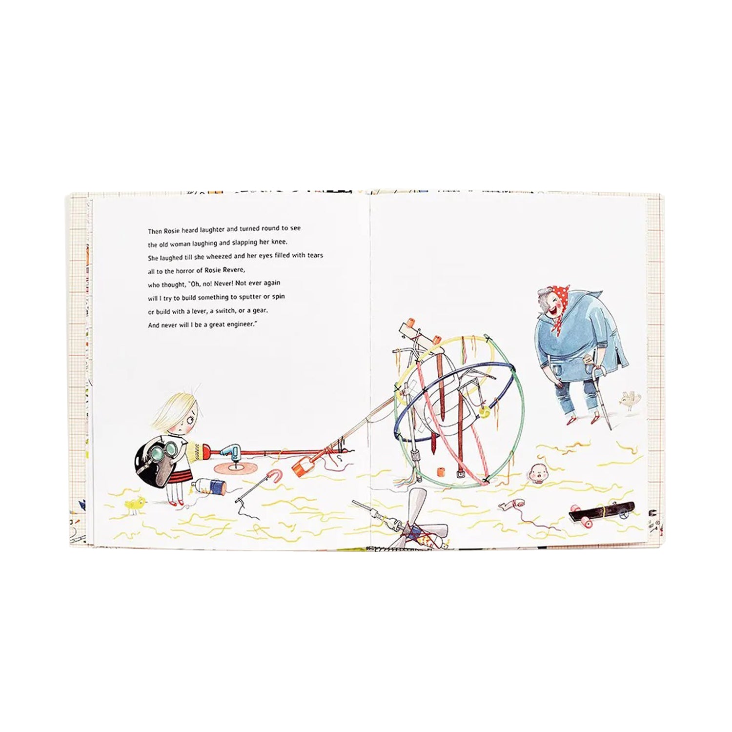 Rosie may seem quiet during the day, but at night she's a brilliant inventor of gizmos and gadgets who dreams of becoming a great engineer. When her great-great-aunt Rose (Rosie the Riveter) comes for a visit and mentions her one unfinished goal--to fly--Rosie sets to work building a contraption to make her aunt's dream come true. But when her contraption doesn't fl y but rather hovers for a moment and then crashes, Rosie deems the invention a failure. On the contrary, Aunt Rose inisists that Rosie's contraption was a raging success. You can only truly fail, she explains, if you quit.