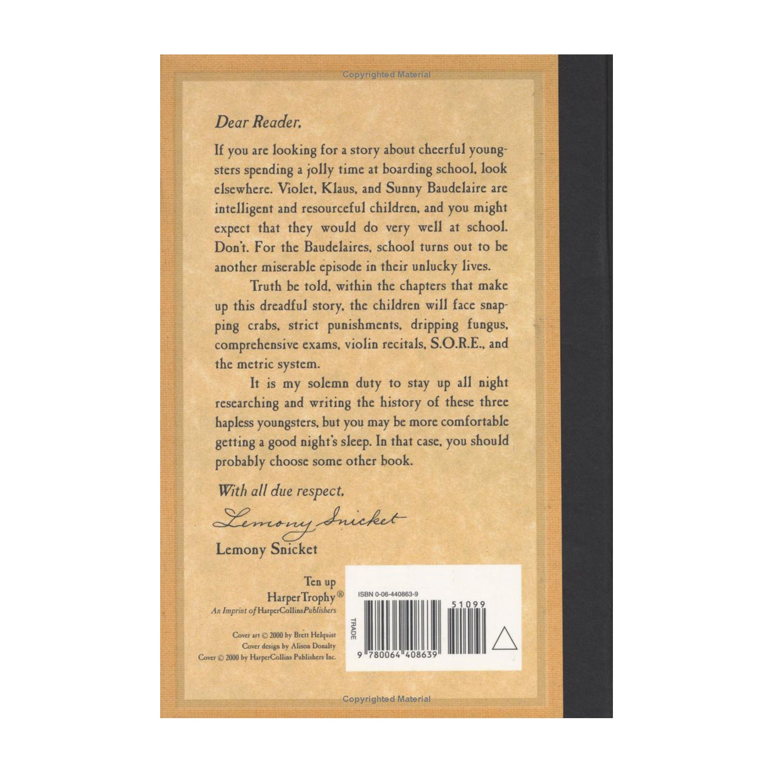 Truth be told, within the chapters that make up this dreadful story, the children will face snapping crabs, strict punishments, dripping fungus, comprehensive exams, violin recitals, S.O.R.E., and the metric system.