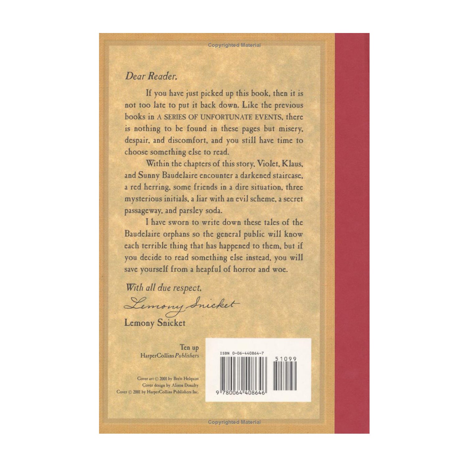 Within the chapters of this story, Violet, Klaus and Sunny Baudelaire encounter a darkened staircase, a red herring, some friends in a dire situation, three mysterious initials, a liar with an evil scheme, a secret passageway, and parsley soda.