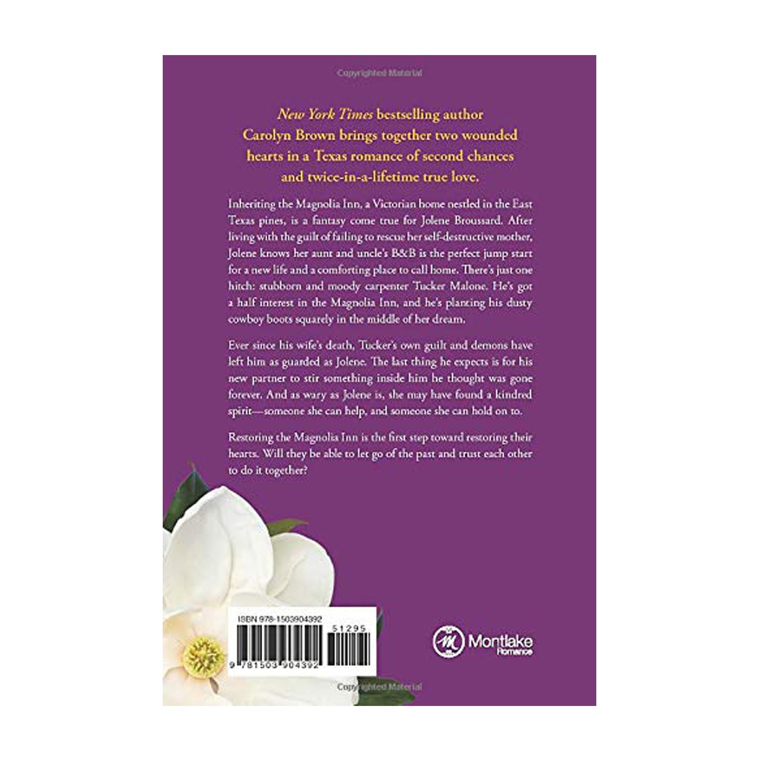 Inheriting the Magnolia Inn, a Victorian home nestled in the East Texas pines, is a fantasy come true for Jolene Broussard. After living with the guilt of failing to rescue her self-destructive mother, Jolene knows her aunt and uncle’s B&B is the perfect jump start for a new life and a comforting place to call home. There’s just one stubborn and moody carpenter Tucker Malone. He’s got a half interest in the Magnolia Inn, and he’s planting his dusty cowboy boots squarely in the middle of her dream.