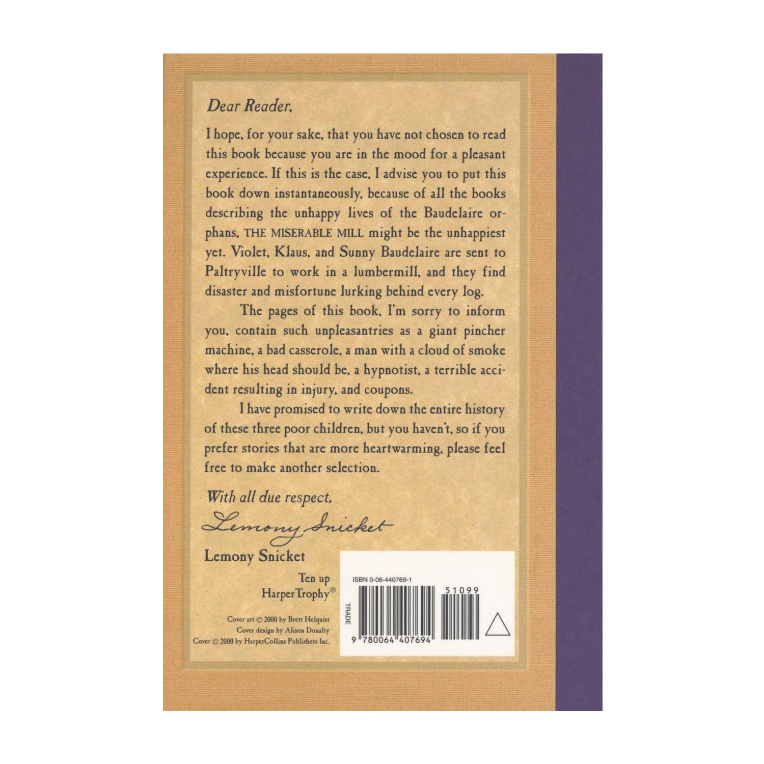 I hope, for your sake, that you have not chosen to read this book because you are in the mood for a pleasant experience. If this is the case, I advise you to put this book down instantaneously, because of all the books describing the unhappy lives of the Baudelaire orphans, The Miserable Mill might be the unhappiest yet. Violet, Klaus, and Sunny Baudelaire are sent to Paltryville to work in a lumber mill, and they find disaster and misfortune lurking behind every log.