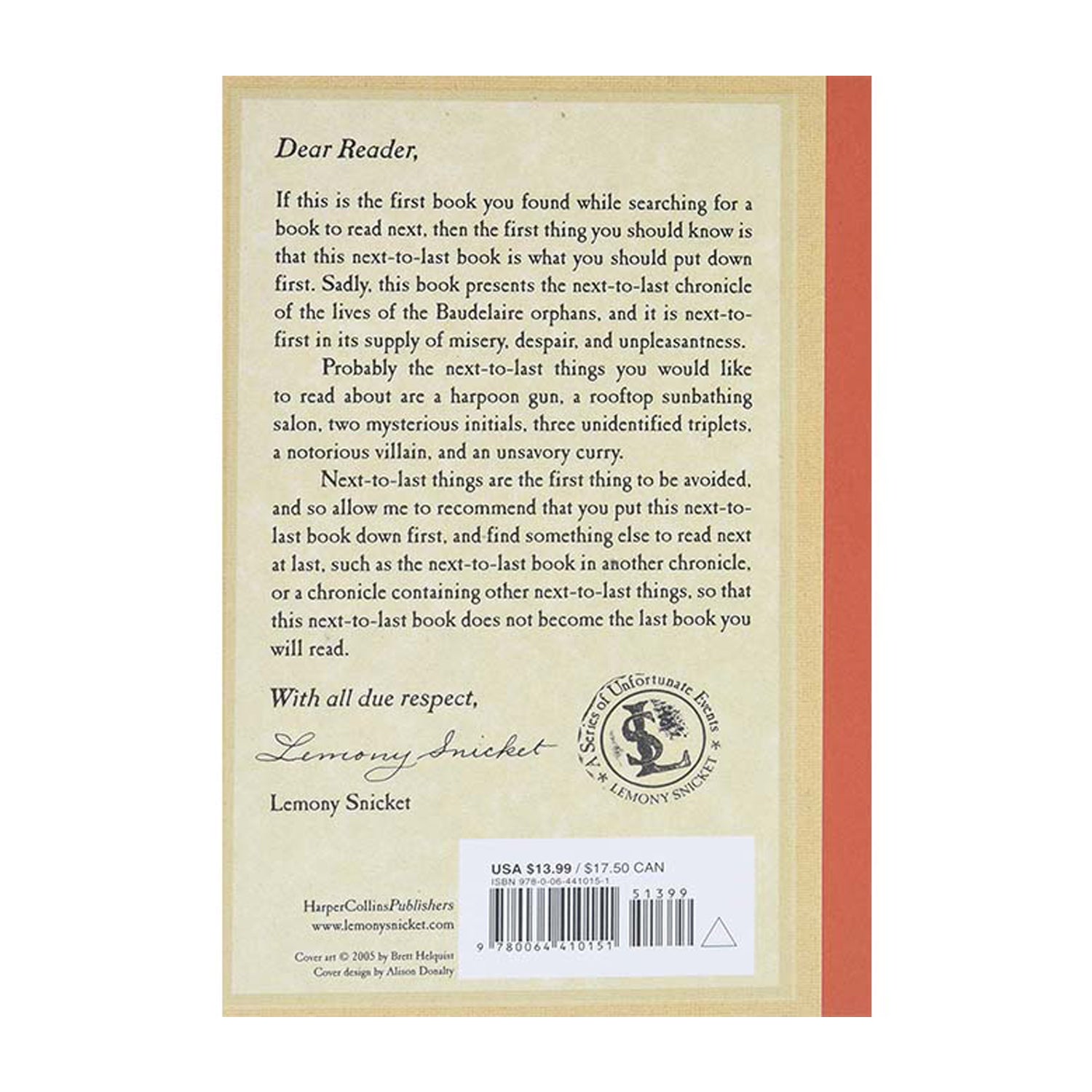 If this is the first book you found while searching for a book to read next, then the first thing you should know is that this next-to-last book is what you should put down first. Sadly, this book presents the next-to-last chronicle of the lives of the Baudelaire orphans, and it is next-to-first in its supply of misery, despair, and unpleasantness.