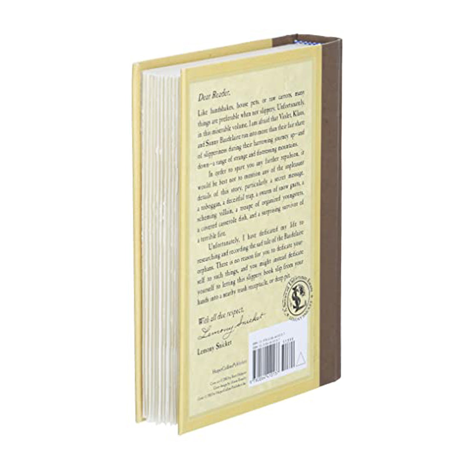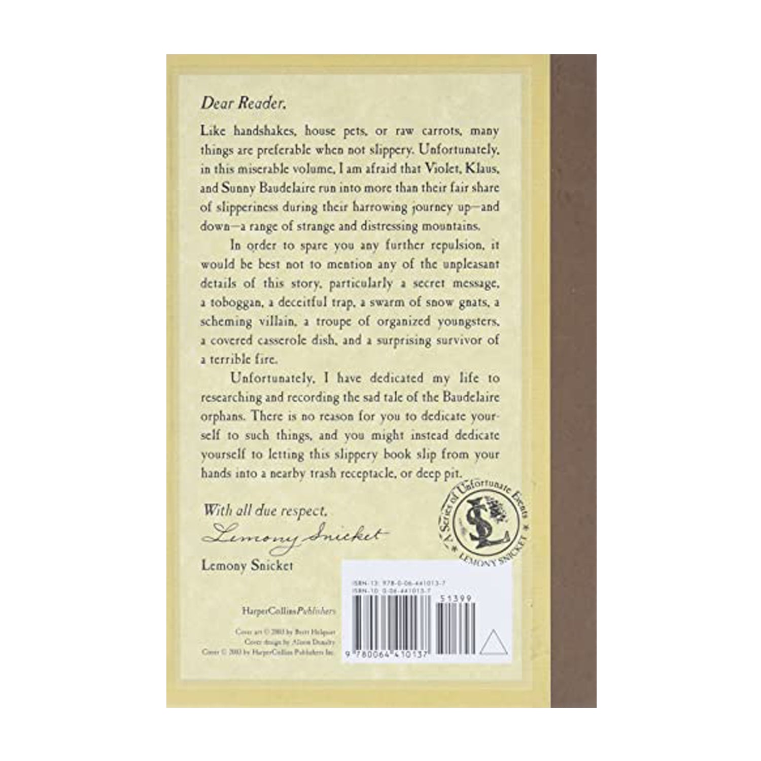 Unfortunately, I have dedicated my life to researching and recording the sad tale of the Baudelaire orphans. There is no reason for you to dedicate your-self to such things, and you might instead dedicate yourself to letting this slippery book slip from your hands into a nearby trash receptacle, or deep pit.