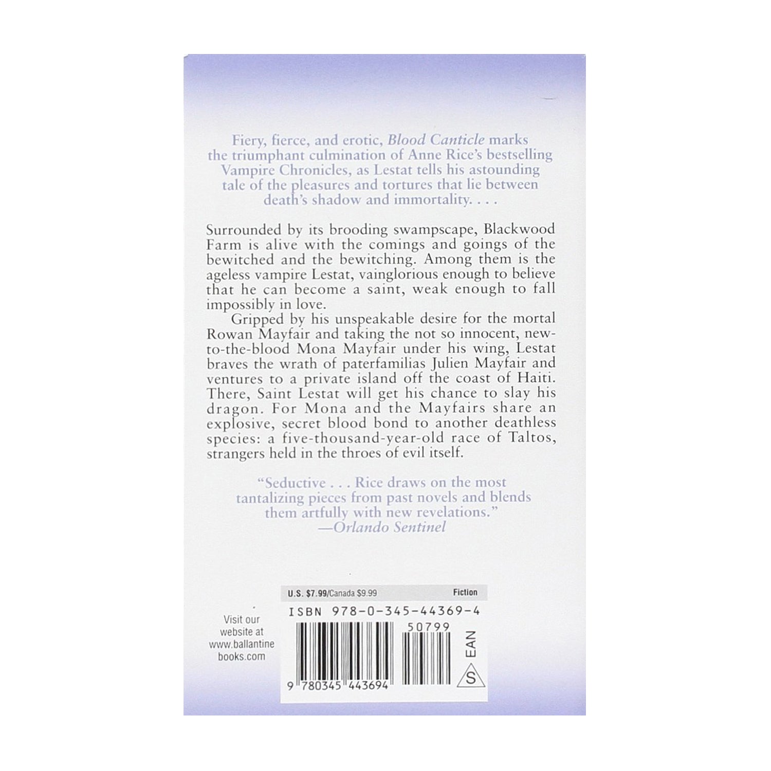 Lestat is back with a vengeance and in thrall to Rowan Mayfair. Both demon and angel, he is drawn to kill but tempted by goodness as he moves among the pantheon of Anne Rice's unforgettable characters. Julien Mayfair, his tormentor; Rowan, witch and neurosurgeon, who attracts spirits to herself, casts spells on others and finds herself dangerously drawn to Lestat; Patsy, country and western singer, who was killed by Quinn Blackwood and dumped in a swamp; Ash Templeton, a 5,000 year old Taltos whose genes live on in the Mayfairs. Now, Lestat fights to save Patsy's ghost from the dark realms of the Earthbound, to uncover the mystery of the Taltos and to decide the fate of Rowan Mayfair. Both of Anne Rice's irresistible realms - the worlds of Blackwood Farm and the Mayfair Witches - collide as Lestat struggles between his lust for blood and the quest for life, between gratification and redemption.
