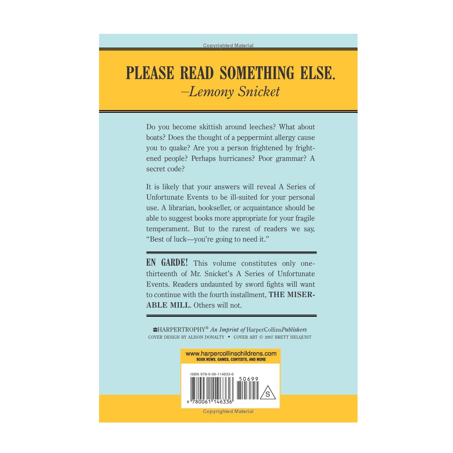 If you have not read anything about the Baudelaire orphans, then before you read even one more sentence, you should know this: Violet, Klaus, and Sunny are kindhearted and quick-witted, but their lives, I am sorry to say, are filled with bad luck and misery. All of the stories about these three children are unhappy and wretched, and this one may be the worst of them all. If you haven't got the stomach for a story that includes a hurricane, a signalling device, hungry leeches, cold cucumber soup, a horrible villain, and a doll named Pretty Penny, then this book will probably fill you with despair. I will continue to record these tragic tales, for that is what I do. You, however, should decide for yourself whether you can possibly endure this miserable story.